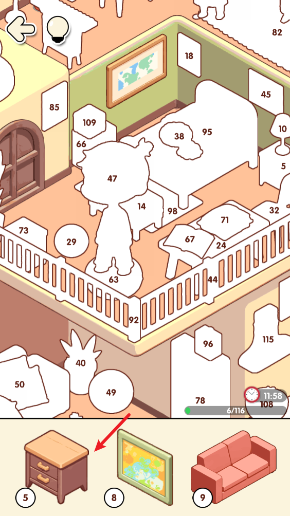 类似拼图或安静书一类的休闲小游戏,6岁小孩应该都能玩。每一关100多块拼图,每一块拼图都标有数字符号,与图中的外观一一对应。关卡有时间限制,放不完就只能看广告加时间,或者重新开始。