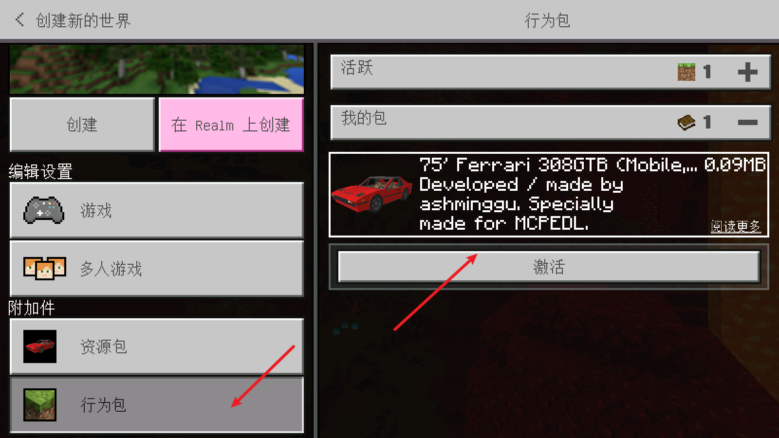3、除了资源包之外,行为包也是一样的操作,完成之后点击创建即可进入游戏。