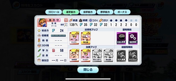 本人原本是猪狩守开局,后来在朋友建议下改为津乃开局,金特方面提供的是「ド根性/メッタ打ち」,BONUS 是减少体力消费,在「突一」之后可以提升蓝格子的出现率是最大的优点。