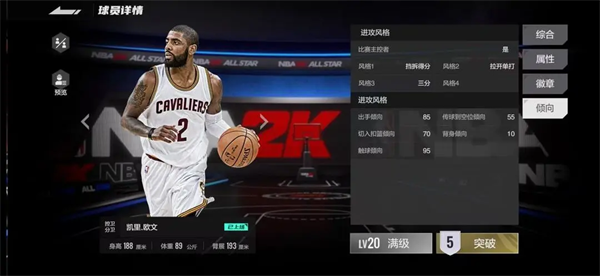 ①主页球员点击所选球员后进入球员详情,左侧点击预览,可以查看球员各等级、突破的综合、属性、徽章等数值。