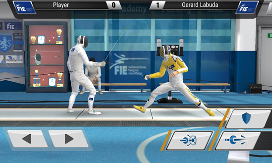 游戏的操作简单,采用的是虚拟按键,与横版格斗游戏类似:左侧箭头为控制运动员前后移动,右侧按键是弓步突刺、直刺和格挡等招式。玩家操控运动员与对手保持合适的距离,判断出招方式就能击中对手有效部位,获得比分。