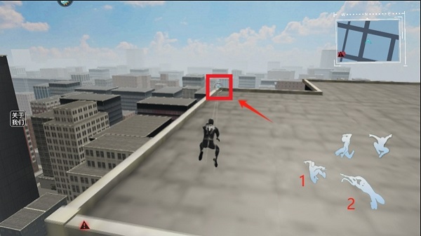 4、出现圆点这个标识,点击1或2,配合移动键就能通过绳索在高楼大厦间穿梭飞行