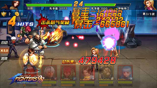 非常简单的一关,神乐千鹤攻击一般,必杀不会秒人,第一波八神庵必杀优先使用,八神庵必杀加一轮普攻解决第一波的神乐千鹤,第二波只要普攻就好,硬抗神乐一个必杀是死不了的,顺便攒怒气,到第三波格斗家怒气应该全部满了,群体必杀优先使用,可先解决前排小怪,这样其他输出就能全力攻击后排神乐,一轮秒杀没问题。