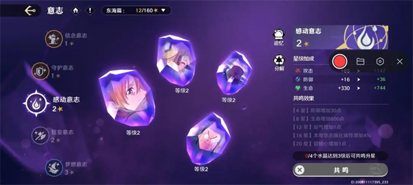 1、一组意志中的所有水晶均达到对应强化等级后,可以对意志进行共鸣提升组合的星级