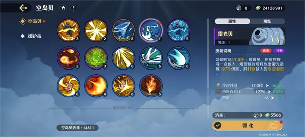 1、在获得空岛贝碎片后,可制造并升级空岛贝、提高空岛贝技能效果、以及提升基础属性。