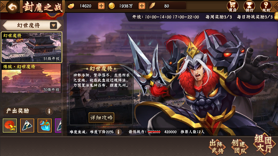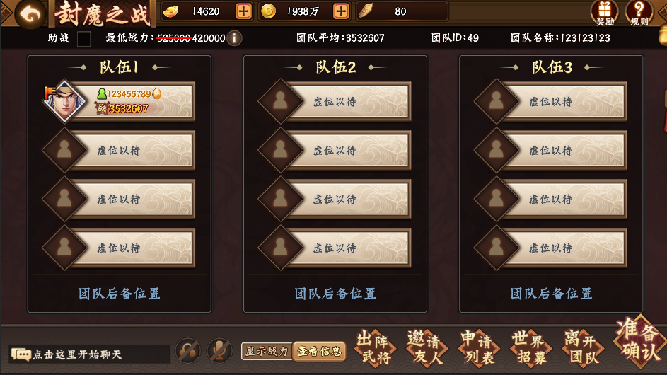 下面有邀请按钮,邀请好友。申请列表,可以同意别人加入团队。世界招募,可发送招募口令。点击显示战力,可以查看玩家战力,以及是否拥有伏魔令。此界面玩家显示的头像即是该玩家选择出阵的武将,需要合理搭配阵容,建议一个小队起码要有一个辅助武将。当所有玩家点击右下角准备确认时,团长即可点击开始团战。