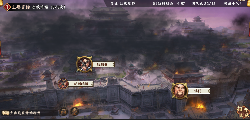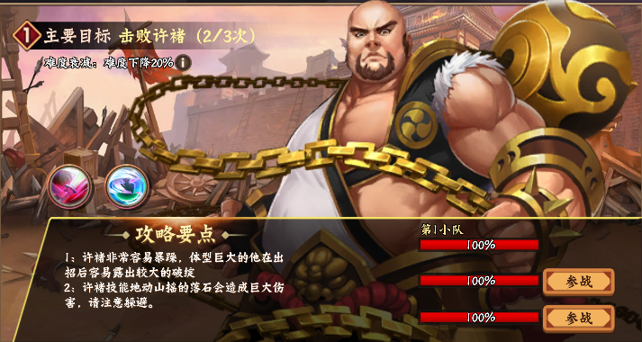 二阶段开启,首先击败司马懿,可以开启最终boss吕布的挑战,挑战吕布,吕布身上的能量罩会在击败曹彰或者夏侯惇时消失一阵,所以一个队伍在攻打吕布时,另外两个队伍需要分别进攻曹彰以及夏侯惇,如果攻打吕布的队伍中途失败或者退出,吕布会回到100%血量。一般来说战力最高的一队进攻吕布,其余两队分别进攻曹彰以及夏侯惇。