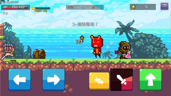 具有经典的横版像素闯关玩法,控制角色左右移动,攻击,防御,释放技能;