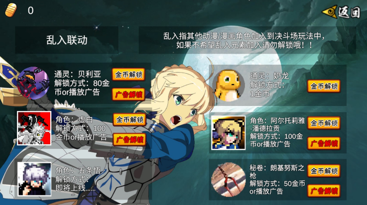 2、在这里可以看到乱入角色、通灵和秘卷,以及即将上线的乱入角色,消耗金币或看广告可以解锁。