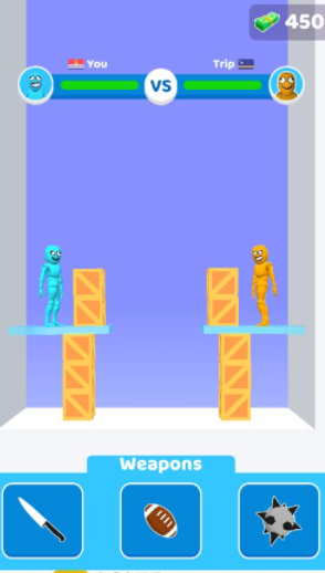 谁先阵亡游戏1v2模式是一款十分刺激的动作对战游戏,玩家在游戏中可以自由的选择武器,使用各种武器来进行投掷对战,瞄准方向和力道来释放,直到一方趴下,完完全全的打倒对手。