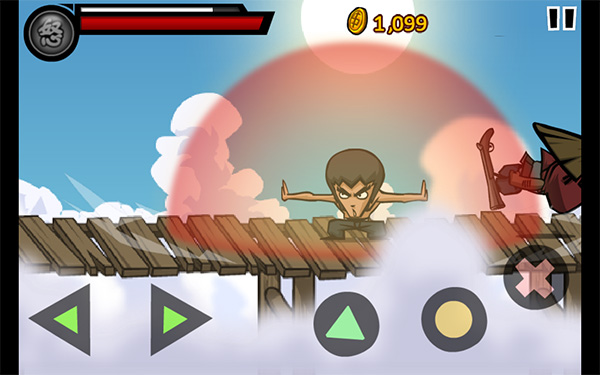 此时,在游戏地图中,可行走的路线分为两路,笔者选择的是“上山路”,之后再按照顺序进行通关。第三关的游戏场景略有变化,切换至危险的木板桥上。相比前两关来说,游戏的敌人数量略有增加。对于防御乱刀的方法还是多利用防御键反击敌人。防御键配合方向键是可以实现跳跃的。这点对于躲避步枪兵的攻击更为有效。