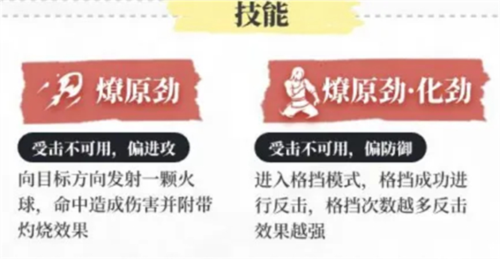 火男的两个技能都不是受击技能。F1技能是释放火球,被灼烧的敌人持续掉血,偏进攻;F2技能偏防御,格挡成功可以反击敌人。