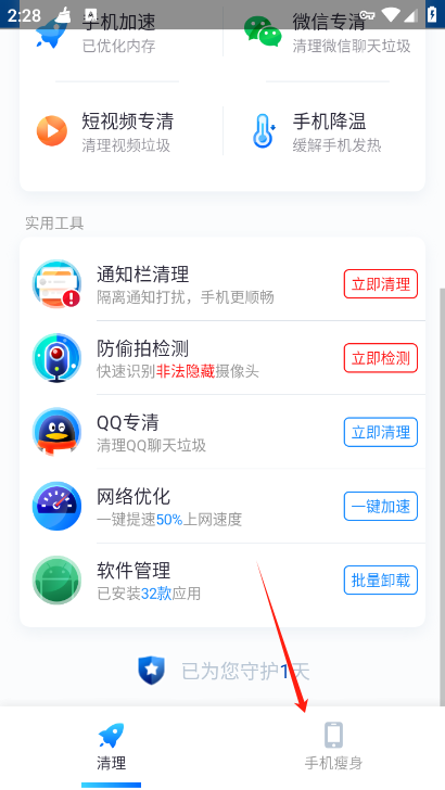 1、可以的,我们直接点击手机瘦身
