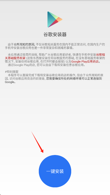 1、在本站下载安装谷歌安装器app并打开,点击一键安装