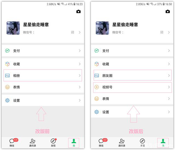最明显的变化,就是微信右下角的【我】,可以看到【相册】被改成【朋友圈】,如果你创建过视频号,那么这里还会显示你的个人视频号入口。