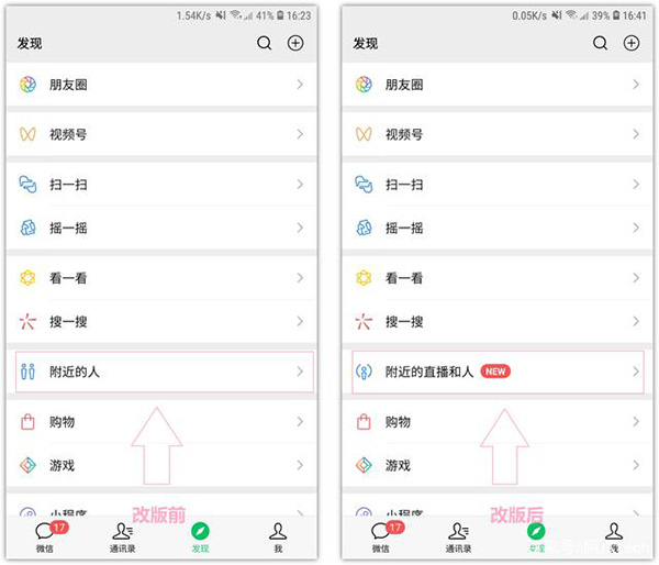 打开微信点击底部的【发现】,将会看到【附近的人】变成【附近的直播和人】,新增了视频和直播功能,里面的视频和直播,都来自于视频号哦。
