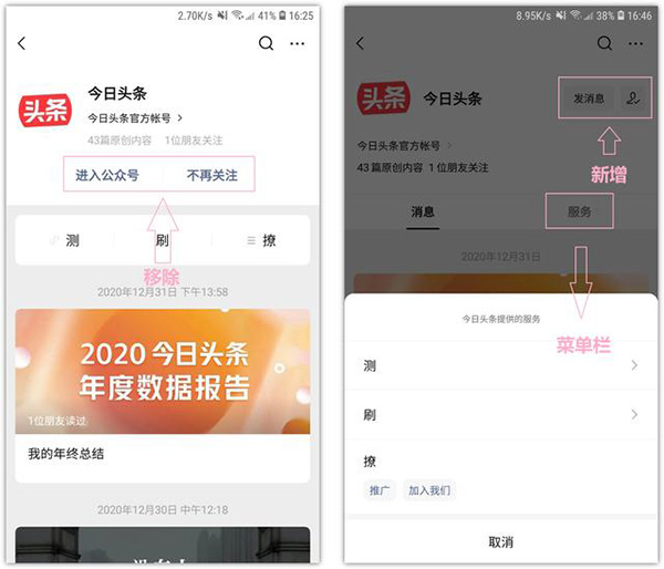 本次更新,公众号界面也有所改变,移除了“进入公众号”和“不再关注”按钮;右侧添加了“发消息”和“取消关注”按钮;菜单栏被添加到【服务】栏目。