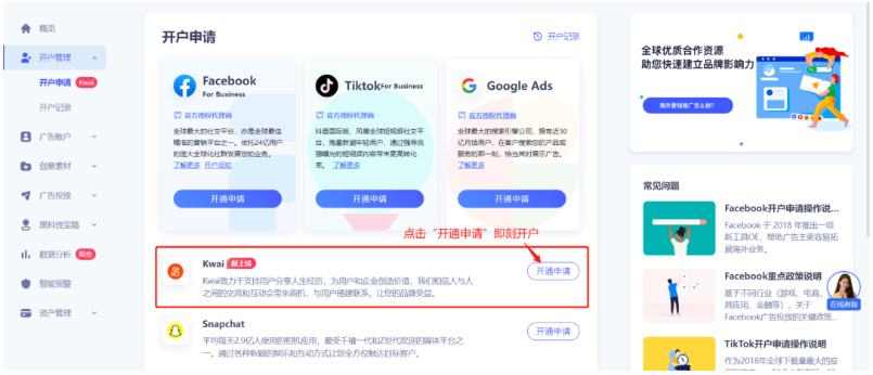 1、打开UniAgency“开户管理-开户申请”页面,点击Kwai的“开通申请”即刻开户。