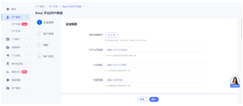 2、 跳转“Kwai平台开户申请”页面,按照表单提示上传填写相关资料。