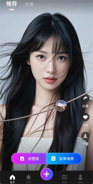 2、打开app的首页,有推荐和丰富的分类可以浏览,海量热门铃声与高清视频来电秀,随心挑选您所喜爱的内容。