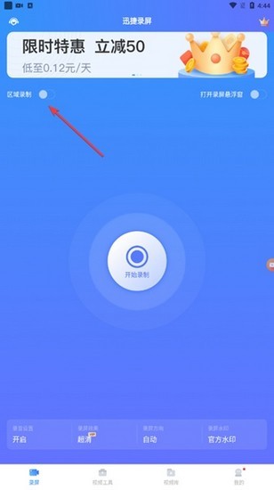 1.点击界面左上角的区域录制功能,将按钮打开。