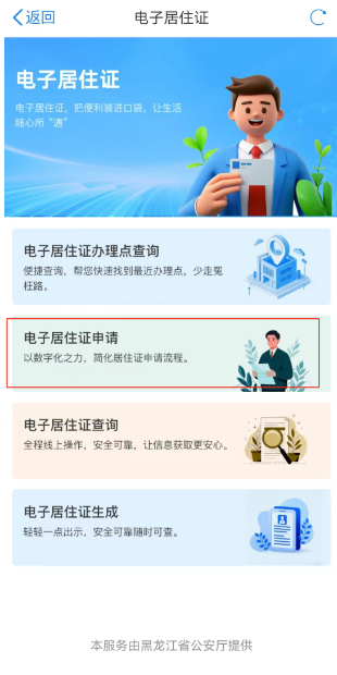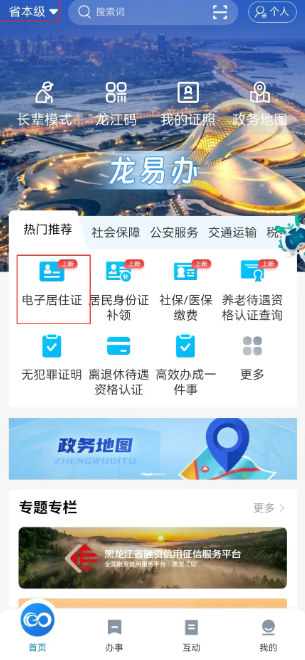 1、打开龙易办APP(黑龙江“全省事”APP),在首页切换至想要申请的站点(省本级或地市站点)后,点击“电子居住证”。