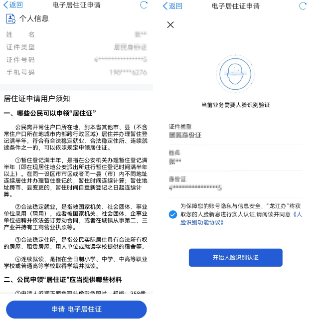 3、进行人脸识别认证后,点击页面上方“申请电子居住证”。