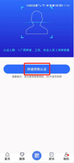 1、打开并登录广西人社app,在“首页”上方找到“待遇认证”按钮,点击进入生存认证主页,点击“待遇资格认证”。