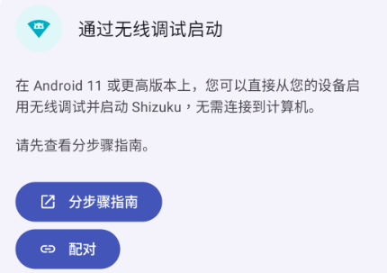 通过无线调试启动适用于 Android 11 或以上版本。这种启动方式无需连接电脑。由于系统限制,每次重新启动后都需要再次进行启动步骤。
