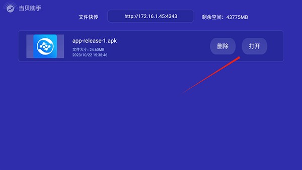 4、上传成功后会直接同步到当贝助手,返回当贝助手中就可以看到已经有文件上传了,这时点击打开即可安装应用