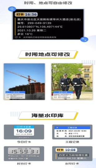 自定义水印相机是一个支持不同方面的打印照片的软件,水印打卡相机支持水印悬浮拍摄、批量图片加水印、快拍水印相机,多彩文字水印,图片水印,走基层、保洁、保安、防疫、物流、快递、新零售、市场营销等行业必备相机。