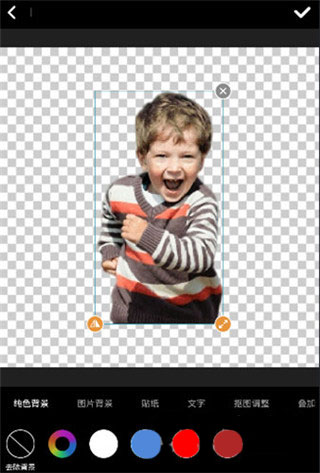 查看抠图效果,不满意的可点击精修去除边缘图案,满意的直接点击【下一步】进入编辑页面,可自行选择图片背景、贴纸、文字、抠图调整、叠加等功能,编辑完成后点击“√”,选择保存即可。