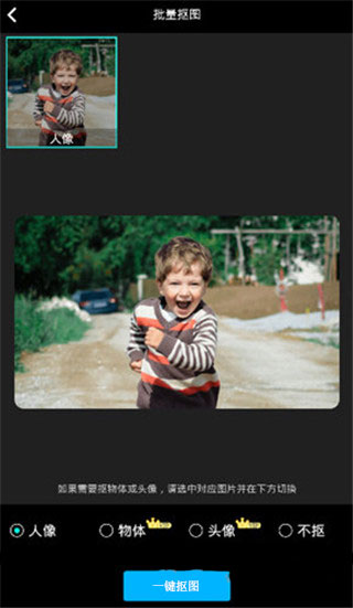 在首页点击【一键抠图】,选择照片,可自行剪裁不需要的部分方便处理,选择人像、物体、头像、不扣,点击【一键抠图】。