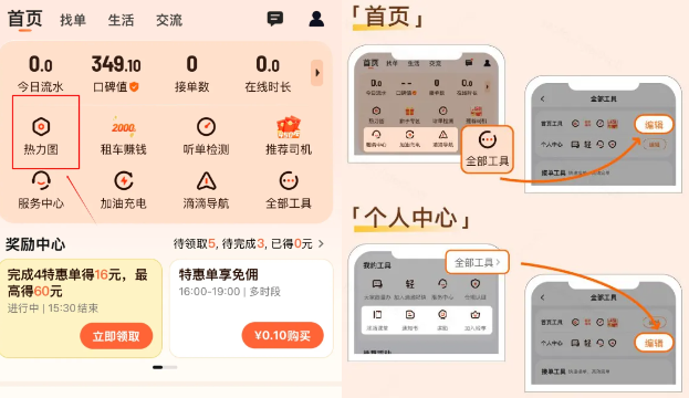 进入首页,点击左上方【热力图】后可查看附近热区,跟着热区跑车,有更大机会接到单哦。