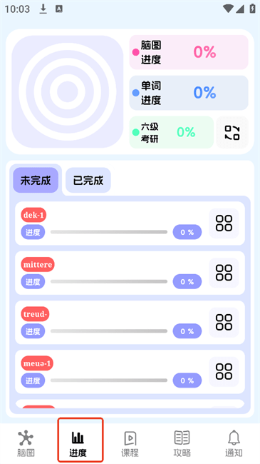 2.在【进度】能看到自己所学课程进度,为后续学习计划提供参考