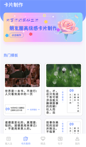 这是一款集高级朋友圈卡片制作、图片制作、句子、文案、诗句、语录、每日一句的文案素材、朋友圈文案,同时提供不折叠输入法。功能丰富,满足您日常不同的需求。