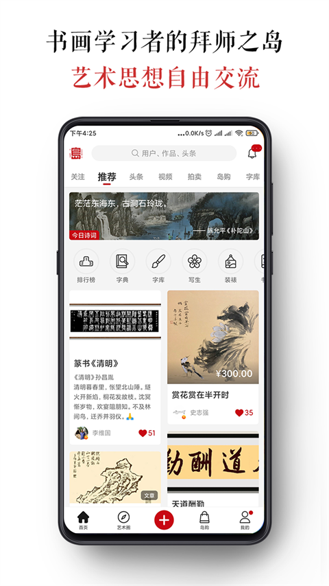 墨客岛app是一款专为书画艺术爱好者打造的学习软件,让来自全国各地的书画爱好者们都可以在这里学习拜师,也能在这查看到各种优秀的书画作品,或者拍卖购买各种名贵字画。这里内容优质,