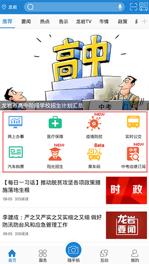 2、在首页,可以看到有网上办事、医疗保障、疫情防控、实时公交、乘车码、成绩查询等多种功能;