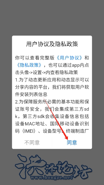 2、进入后阅读并同意洪泽论坛app的用户协议