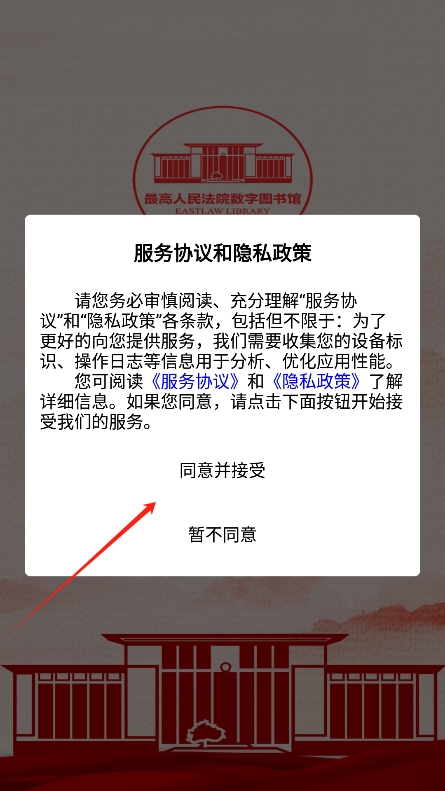 2、进入后同意最高人民法院数字图书馆app的用户协议