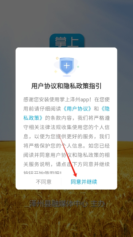 1、在本站下载安装掌上泽州app并打开,首先同意服务协议