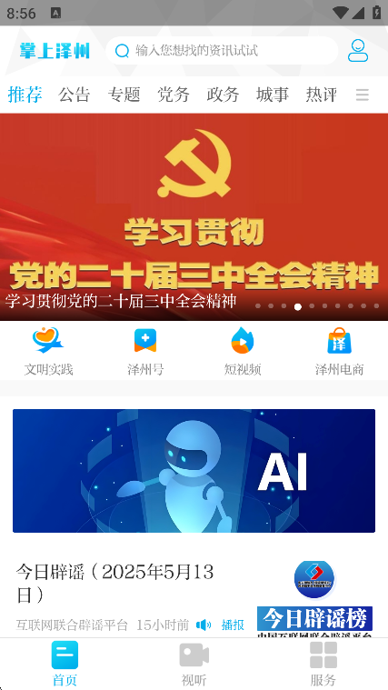 掌上泽州app是一款专门为本地打造的生活服务平台,在这个平台也是带来了全面的生活服务内容,用户朋友可以随时随地获取到新闻资讯信息等等,让大家都能够通过平台快速了解到本地大小事,有需要的朋友现在就来下载吧!