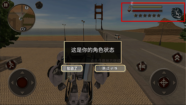6、右上角展示你的角色状态,分别是体力、血量和通缉等级(不要随意攻击路人哦,会引来警察通缉),点击拳头按钮可以切换武器。