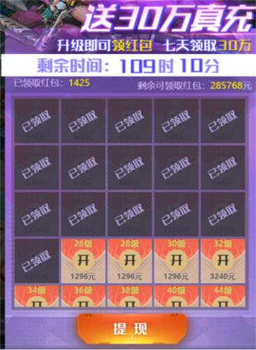 1、开局参与全民冲级领30万真充活动,等级越高,领取的钱包余额就越多,活动是开服7天内均可参与,保持活跃即使不充钱也能玩得很舒服!