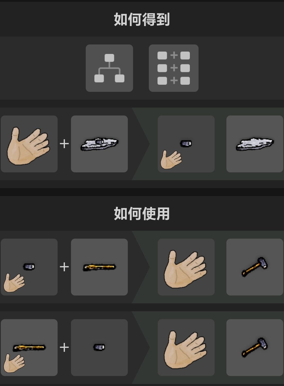 其中一个钢锭用石头打一下得到打铁锤头等待它冷却把它放在短木棍上得到锻造锤