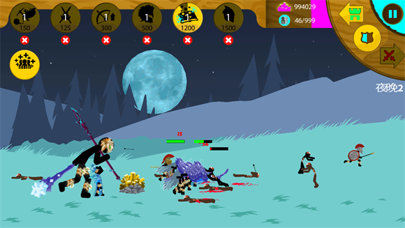 11、第十一关:冰冷山区,对方基本上是满级战斗单位,前期6矿工大力发展经济,先养四排剑士,后期开始养巨人(击退)升级:矛士盾,剑士之剑