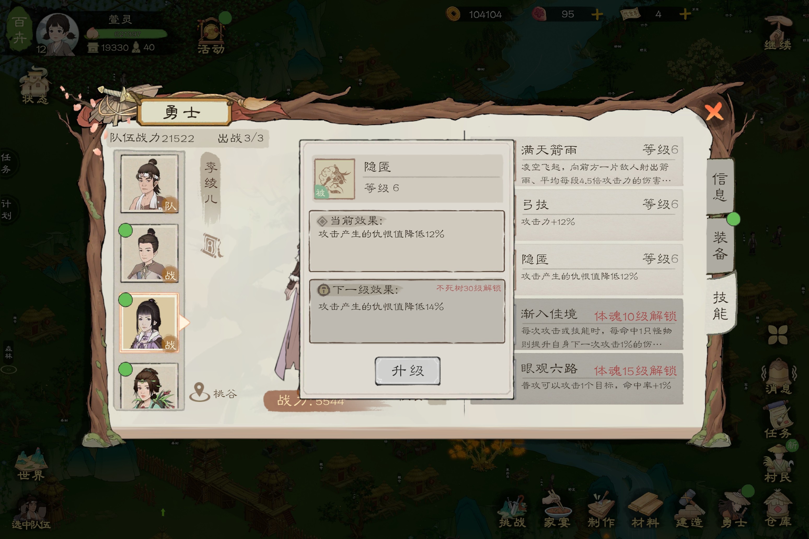 注:可通过提升不死树等级来升级勇者的主动被动技能,每提升五级不死树可升级一级勇者都主动被动技能(不死树需要每天施肥升级)