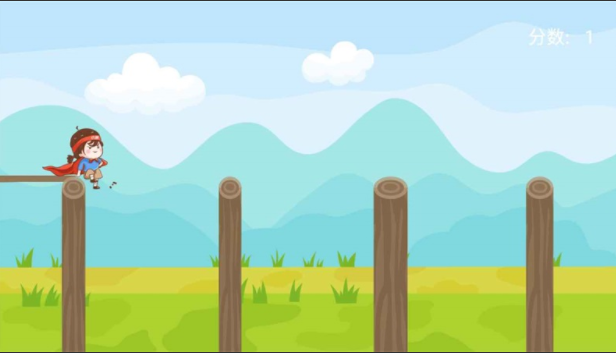 1、进入游戏点击开始,控制游戏中的主角开始闯关,在木桩之间搭木板。