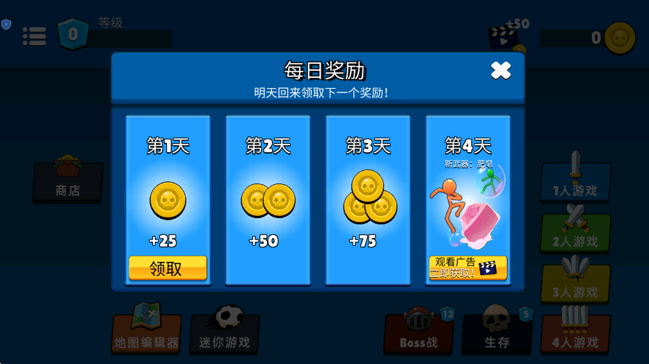 2、每天登录游戏可以领取金币奖励,赢得比赛可以解锁新的角色和招式,提升火柴人的战斗能力。