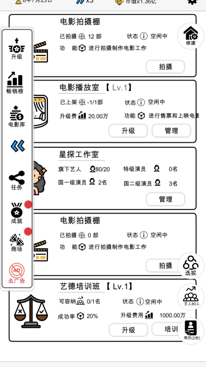 1、题材丰富的模拟经营游戏,来帮你完成导演的梦想,多种玩法等你体验。